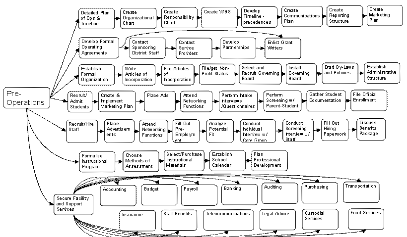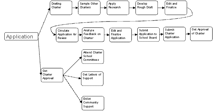 The critical path was found to be contained in the Application phase, with Pre-Operations phase containing the second critical path. The critical path in the Application phase was determined by the potential time for the charter approval, from drafting to actual approval. Its duration was determined to be 237 days. The second critical path was found in the Establish Formal Organization task in the Pre-Operations phase. Its time was determined to be 212 days. This path includes Write and Submit Grants, Receive Funding, Hire Staff, and Formalizing the Organization and Instructional Program. (See Appendix 1)